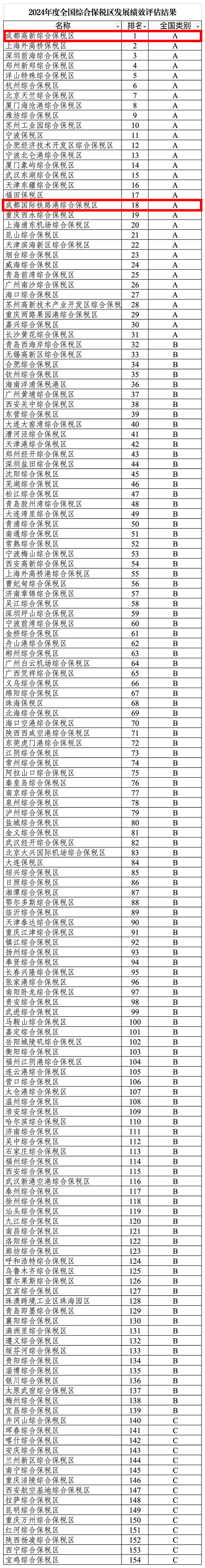 此次排名中,成都高新综合保税区、成都国际铁路港综合保税区均评为全国“A类”,分别位居全国综合保税区第一、第18位。其中,与2023年排名相比,成都国际铁路港综合保税区上升了10位。