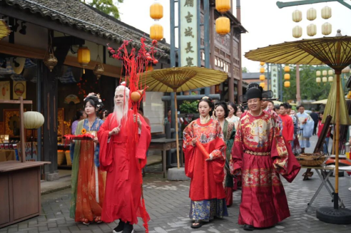 清晨,武侯区民政局婚姻登记处洋溢着喜气,10对新人们身着凤冠霞帔登记结婚,许下一生的承诺。随后,他们登上装饰精美的“爱情巴士”在欢声笑语中向锦里进发。抵达锦里后,身着古装的“囍神”引领新人穿过熙熙攘攘的游客群,步入古戏台,行牵巾礼、执手宣誓,在特邀颁证师的见证下,郑重接过象征承诺的结婚证书。