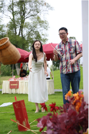 在金牛区,府河摄影公园婚姻登记处也热闹非凡,投壶、香囊制作等互动体验吸引新人们驻足参与。大家在玩乐中感受传统文化的魅力。还有特别增设的互动抽奖环节,让参与活动的银龄夫妻、新人们欢声笑语不停回荡,现场一片温馨幸福景象。“传承导师”黄女士表示,能在现场为新人们送祝福、分享生活经验,她感到很开心很荣幸,希望自己的经验能帮到大家,也祝福新人们百年好合,永结同心!