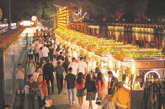 当游船经过一些热闹的岸边街区时,还能看到街头艺人的精彩表演。这不仅展现了成都这座城市的多元文化,也体现出夜经济下市民丰富的精神文化生活。下船后,记者们在东门码头的文创市集驻足。摊位上,以熊猫元素、三国文化为灵感的书签、摆件等文创产品琳琅满目,不少游客正挑选心仪的纪念品,还有不少NPC在岸上与游客们变戏法、写书签、画扇面等互动。“从船上看景,到岸边逛市集,体验很连贯。”不少记者表示,这种“船上观赏+岸上消费”的模式,让夜游的乐趣得以延伸。