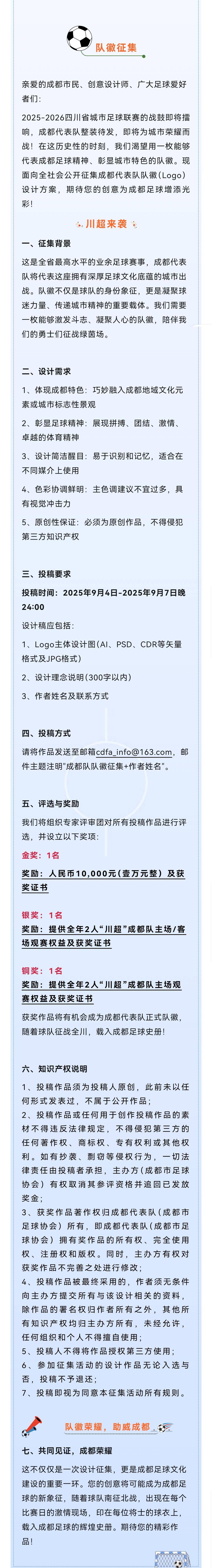 根据成都足协公布的设计需求,队徽要体现成都特色、彰显足球精神,同时设计简洁醒目、色彩协调鲜明,还要保证原创性。投稿时间为2025年9月4日-2025年9月7日24:00。