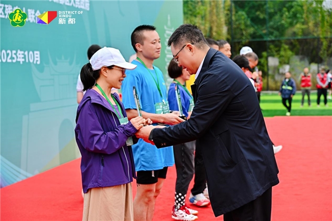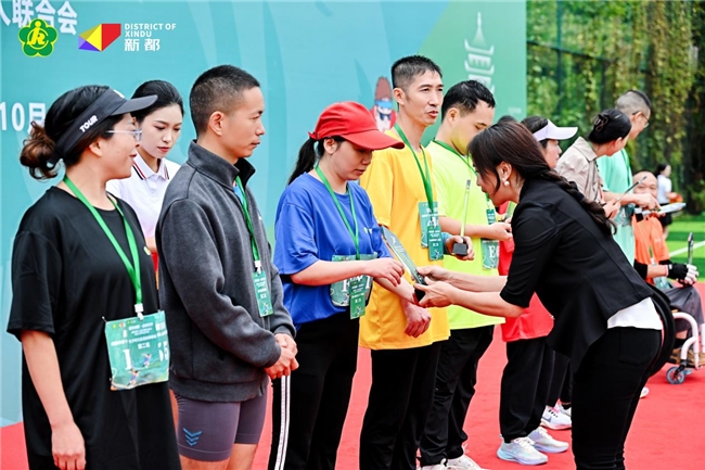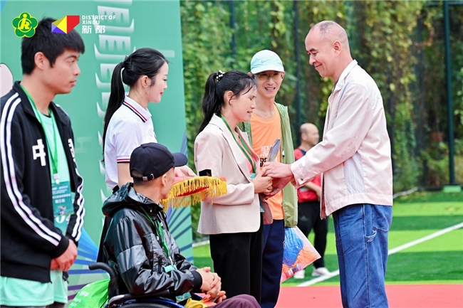 (新都区残联党组成员、副理事长吴子建为第三名获奖选手颁奖)