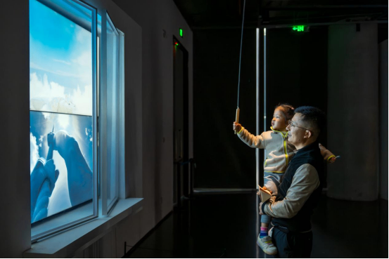 成都市美术馆内,观众在与展厅内的数字屏与光电装置进行互动。
