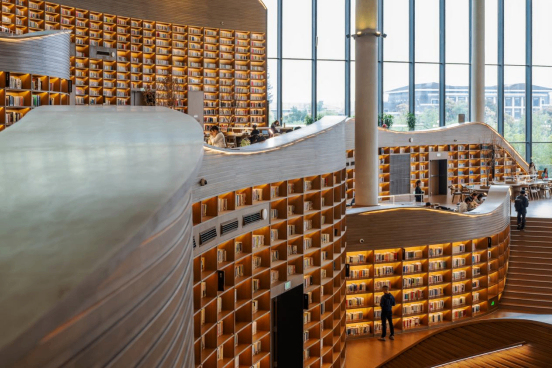 在天府人文艺术图书馆,最令人印象深刻是大厅。以四川竹文化为主调打造的书架设施,高低有致地排开,如连绵山峦,透着清新雅致,设计取义于“书山有路勤为径”。蜿蜒的楼梯穿插其中,透过“书山”边的玻璃幕墙能饱览湖光,坐在休闲软椅上,读者们舒然开卷。