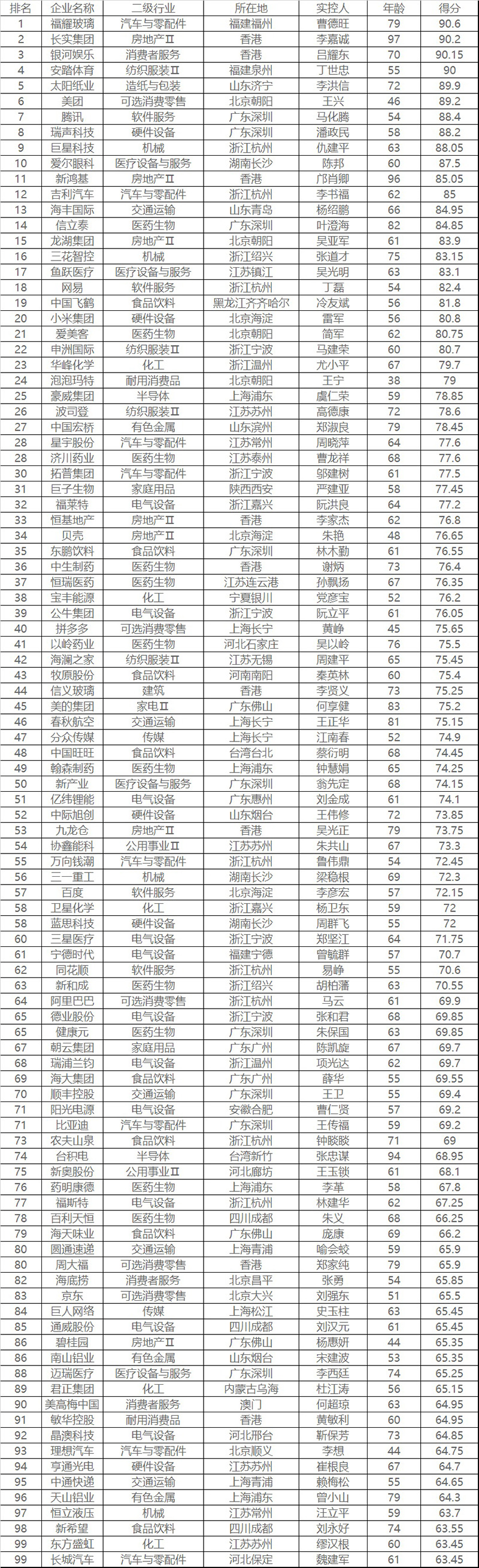 福耀玻璃、长实集团、银河娱乐、安踏体育、美团、腾讯、网易、阿里巴巴、小米集团、京东、恒瑞医药、药明康德、中际旭创、宁德时代、通威股份、吉利汽车、比亚迪、万向钱潮、春秋航空、顺丰控股、中国飞鹤、美的集团、海澜之家、波司登、牧原股份、新希望等企业均成功入选该榜单。