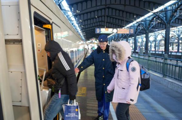 中国铁路哈尔滨局集团有限公司工作人员(中)在哈尔滨火车站为旅客服务。