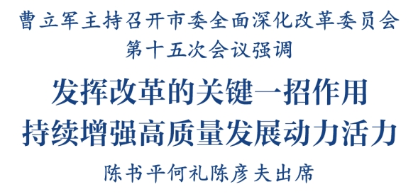 3月16日,市委全面深化改革委员会第十五次会议召开。省委常委、市委书记曹立军主持会议并讲话。他强调,要深入学习贯彻习总书记关于全面深化改革的一系列新思想新观点新论断,认真落实党中央和省委部署要求,发挥改革的关键一招作用,持续增强高质量发展动力活力。
